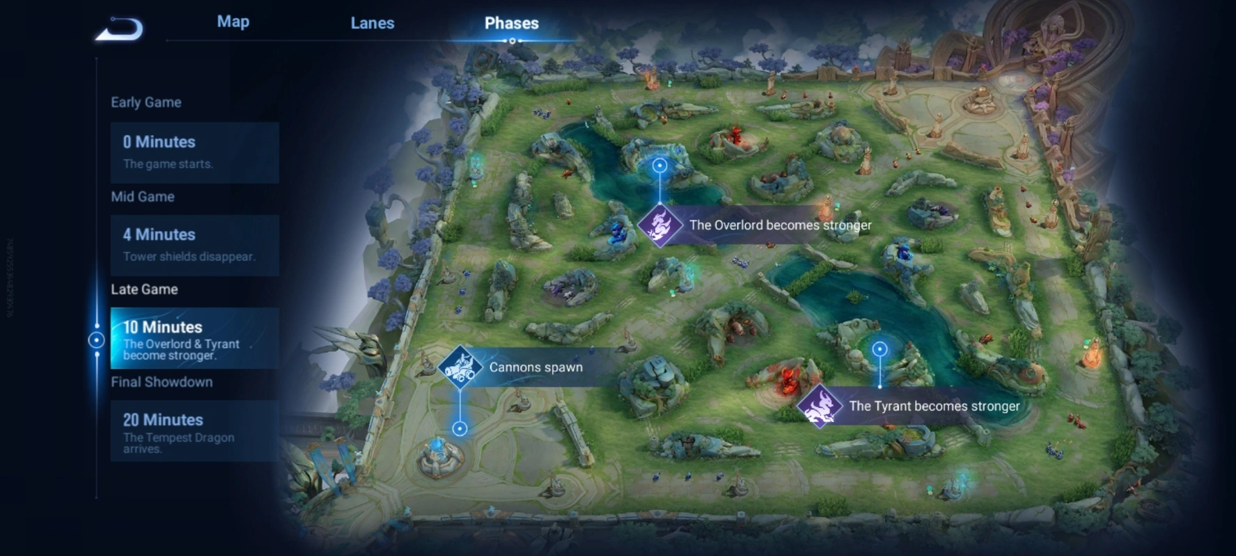During the 4-10 minute phase, securing objectives becomes a high priority. The first major objectives, such as the towers in each lane, should be contested as they offer valuable gold and map control. Taking down an enemy turret not only weakens the opponent but also opens up the opportunity to push deeper into their territory and secure their farm and gold supply. Jungle monsters, including buffs or special monsters like the Overlord/Tyrant (Spawns 0400, 0800) should also be prioritized during this phase, as they provide both team-wide buffs and additional gold/experience. After 4 minute mark, outer turret shields are broken (defense stats lowered), and one of the ranged mage minions in each wave will be replaced by a ballista with increased damage.